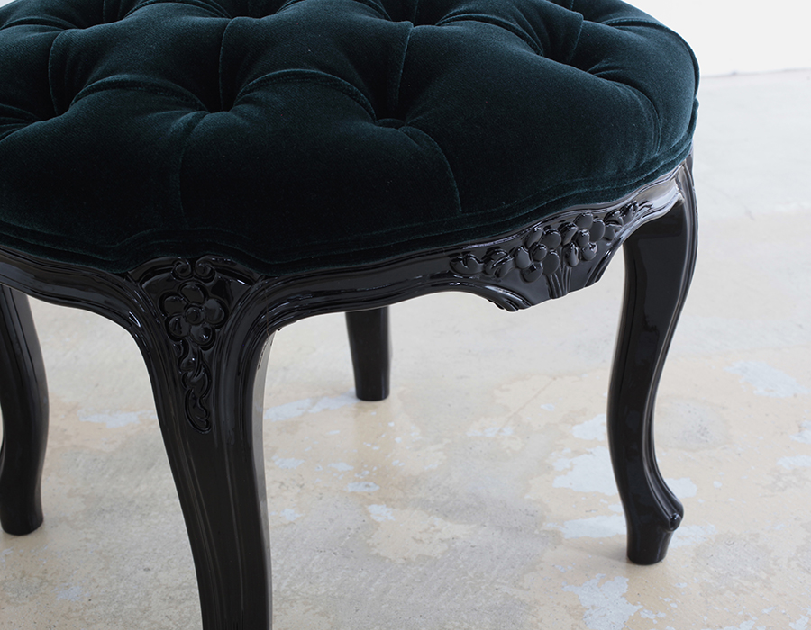 フレームは樹脂を吹き付け、ピアノ塗装のような艶を出したウレタン塗装仕上、座面は21個のボタン止めとなります。